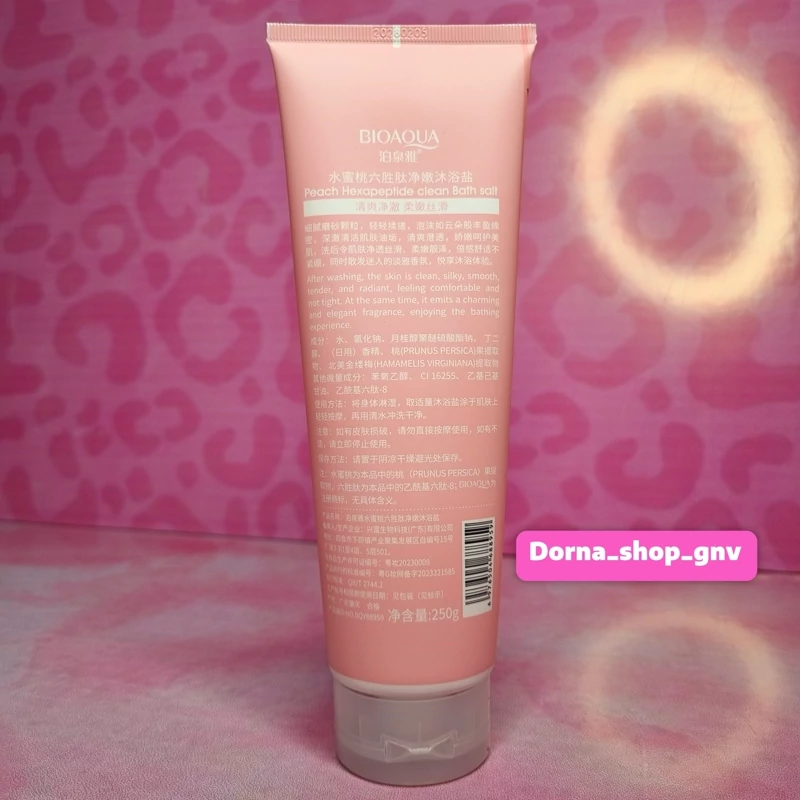 عصاره هلو حاوی انواع ویتامین های A و B و C می باشد و آنتی اکسیدان قوی و طبیعی می باشد. مصرف عصاره هلو به عنوان یک محصول مراقبتی باعث افزایش جریان خون زیر پوستی می شود و در نتیجه خستگی را کاهش می دهد. عصاره هلو همچنین یک محرک قوی برای کلاژن سازی پوست است که نباید از آن غافل شد. ترکیب هلو با نمک طبیعی دریا انصافا ترکیب شگفت آور و نوینی است!، این ترکیب می تواند به راحتی و به سرعت تیرگی های کهنه پوست شما را بهبود دهد و بازسازی کند. این نمکها روشن کننده، مرطوب کننده و سفید کننده پوست شما میباشد و با رایحه بسیار خوشبو و معطر هلویی خود تجربه ای لذت بخش را برای شما فراهم میکند.