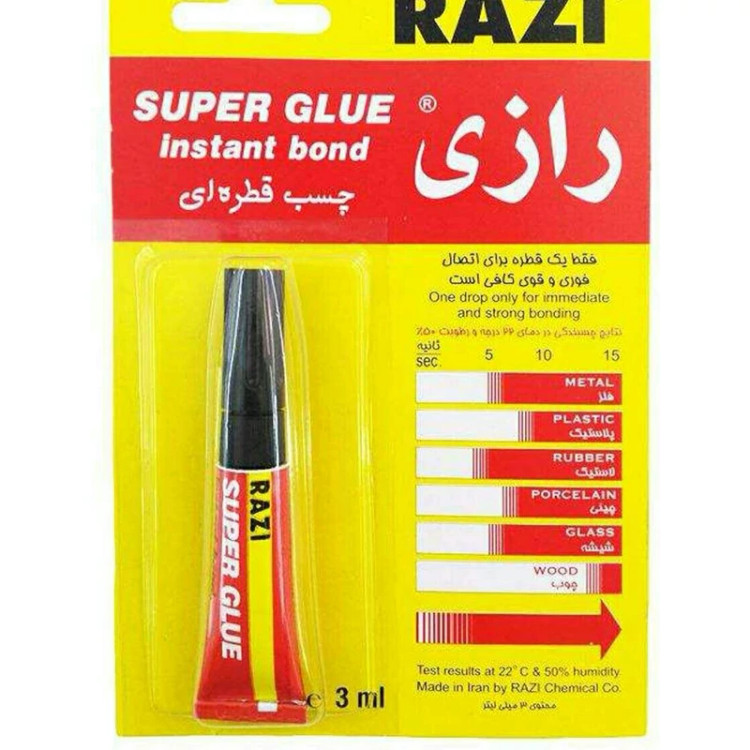 چسب قطرهای فوق یکی از محصولات تولیدی شرکت «رازی» (Razi) است. این محصول قدرت چسبندگی بالایی دارد و از آن میتوان برای چسباندن سطوح مختلفی مانند چوب، فلز، پلاستیک، شیشه، کاشی، سرامیک و چینی استفاده کرد. قدرت بالای چسبندگی و زمان خشکشدن مناسب این چسب قطرهای، آن را به محصولی بسیار کاربردی تبدیل کرده است. ساختار این چسب بهگونهای است که در مجاورت هوا خشک میشود. از دیگر مزایای این چسب قطرهای میتوان به شفافیت آن اشاره کرد که موجب تمیزتر شدن کار پس از اتمام میشود. این چسب دارای حجم 3 میلیلیتر است.