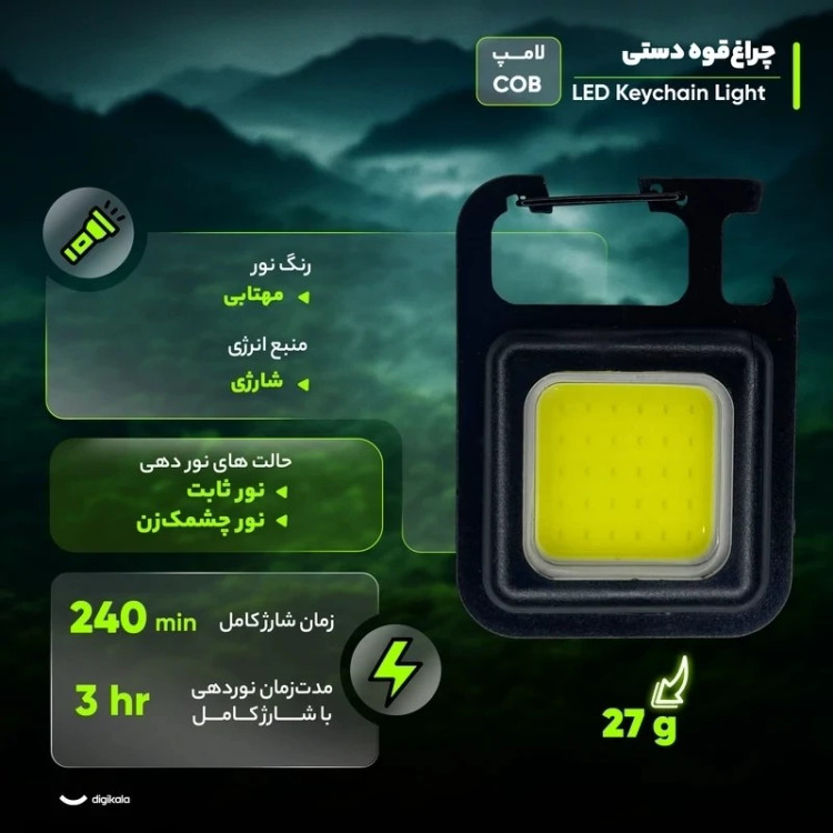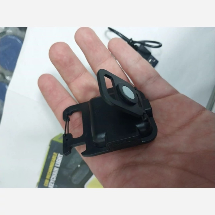 چراغ قوه دستی مدل LED KEYCHAIN LIGHT دارای مگنت در پشت آن جهت نصب آسان و استفاده بهتر از آن، چندمنظوره COB دربازکن دار، ضدضربه، ضدرطوبت و ضدآب، شارژی است و از یک باطری داخلی ظرفیت بالا تغذیه میکند که با کابل USB تایپ C بهوسیله آداپتور یا پاوربانک قابلشارژ است.