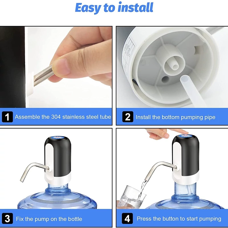 در صورت شارژ کامل می توان از 4 تا 6 گالن آب استفاده کرد. دارای استفاده آسان با فشار دادن سوئیچ دستگاه بدون سر و صدا برای بچه ها و بزرگسالان است. بطری های با ظرفیت 1 تا 5 گالن (4.5 تا 19 لیتر) استفاده می کند. کوچک و سبک بسیار مناسب برای استفاده در خانه یا محل کار و ایده آل برای کمپینگ. آموزش نصب به این صورت است: 1. شلنگ سیلیکونی و لوله استنلس استیل را به پمپ آب برقی شارژی وصل کنید. 2. شلنگ سیلیکونی را داخل گالن آب قرار داده و پمپ آب را بر روی سر گالن قرار دهید. 3. دکمه را فشار دهید تا پمپ آب برقی شارژی روشن شود. 4. مجدد دکمه را فشار دهید تا پمپ آب برقی شارژی خاموش شود. نکات مهم از این قرار است: لطفاً 5 ساعت قبل از استفاده اول پمپ آب برقی شارژی را شارژ کنید. چراغ قرمز هنگام شارژ روشن می شود. پمپ آب برقی شارژی را در آب غوطه ور نکنید. در هنگام شارژ پمپ آب برقی از آن استفاده نکنید. از پمپ آب برقی شارژی را در هنگام خارج بودن از گالن آب و نبودن آب داخل گالن استفاده نکنید.
