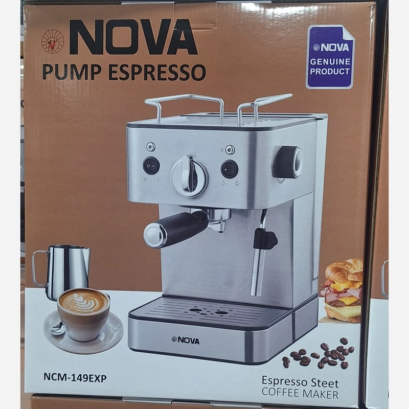 اسپرسو و قهوه ساز 149 نیمه صنعتی تمام استیل نوا 1500 وات پمپ 25 بار ولوم بغل اسپرسوساز نووا با هواگیری رایگان مدل NOVA NCM-149EXP