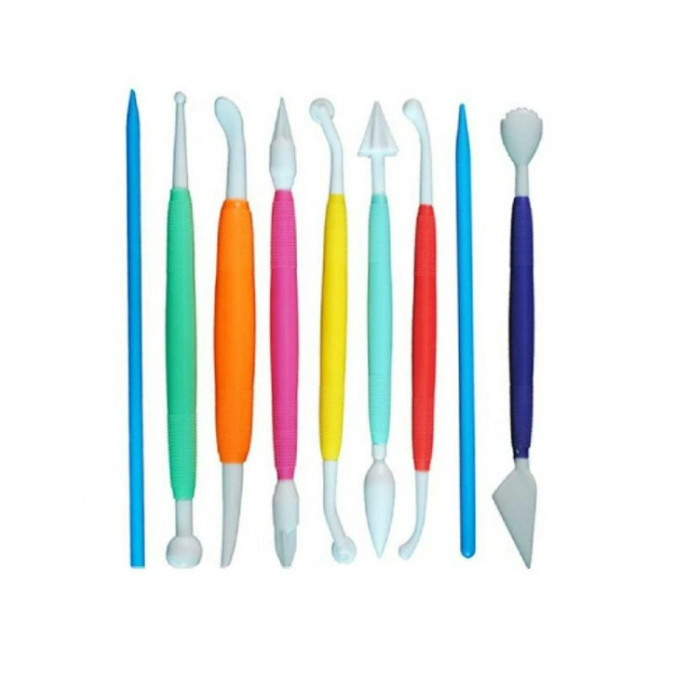 ۹ عدد ابزار دو سر (در مجموع ۱۸ شکل) جهت شکل دادن خمیر عروسک، ساخت انواع شکل ها با انواع خمیر ها برای طراحی و مجسمه سازی، برای کار روی کیک و شیرینی پرکاربردترین ابزار برای شکل های انواع خمیر در رنگ بندی مختلف است