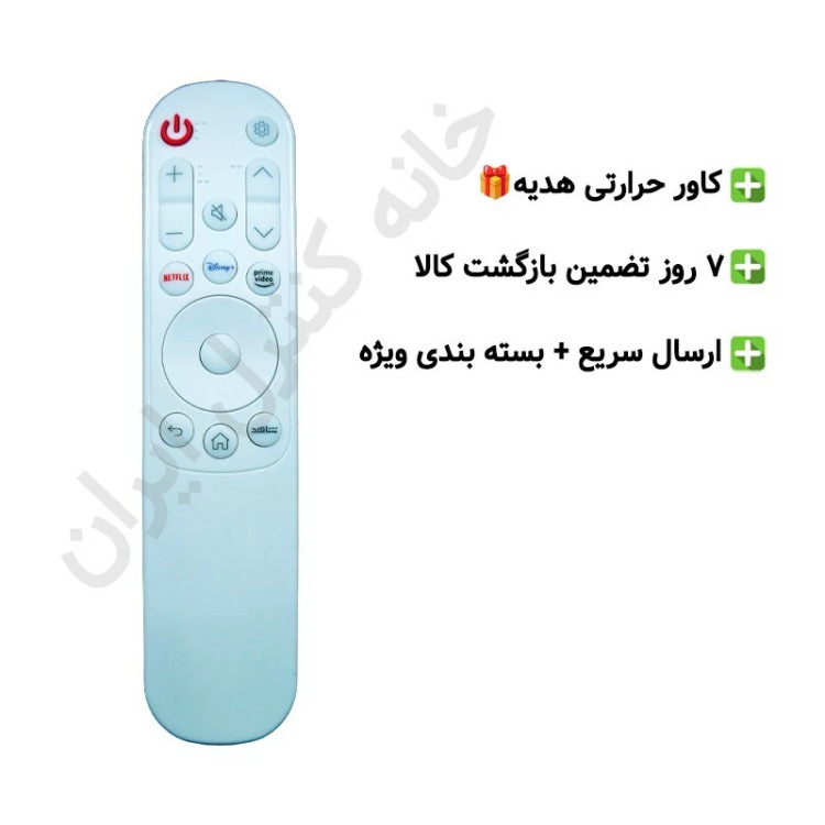 این محصول، کنترل تلویزیون ال ای دی هوشمند ال جی LG (سفید) می باشد. این کنترل، به وسیله دو عدد باتری نیم قلم مورد تغذیه قرار گرفته و هم اکنون در رنگبندی سفید، موجود و قابل سفارش می باشد.