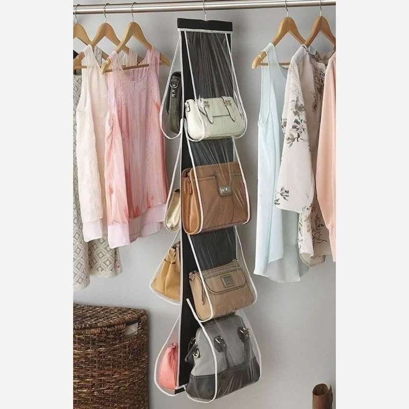 دارای آویز چوب لباسی کاهش فضای مورد نیاز برای نگهداری از کیف ها مانع از خراب شدن و یا از بین رفتن فرم اولیه سهولت در دسترسی و استفاده از کیف ها امکان آویزان کردن داخل کمد ، روی دیوار ، پشت درب و …