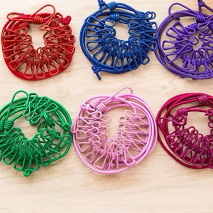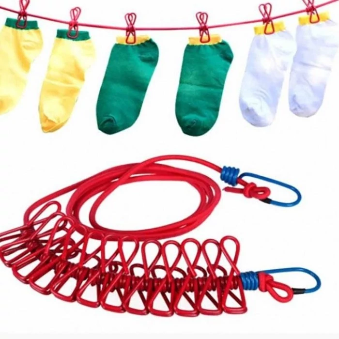 جنس: کشی ابعاد: متراژ طناب در حالت عادی 2 متر است و خاصیت کشش دارد. دارای: 12 عدد گیره و 2 قلاب آویز در دو طرف سر طناب برای نصب آسان است