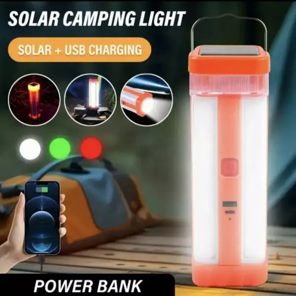 این چراغ کمپینگ دارای پنل خورشیدی داخلی برای شارژ است.